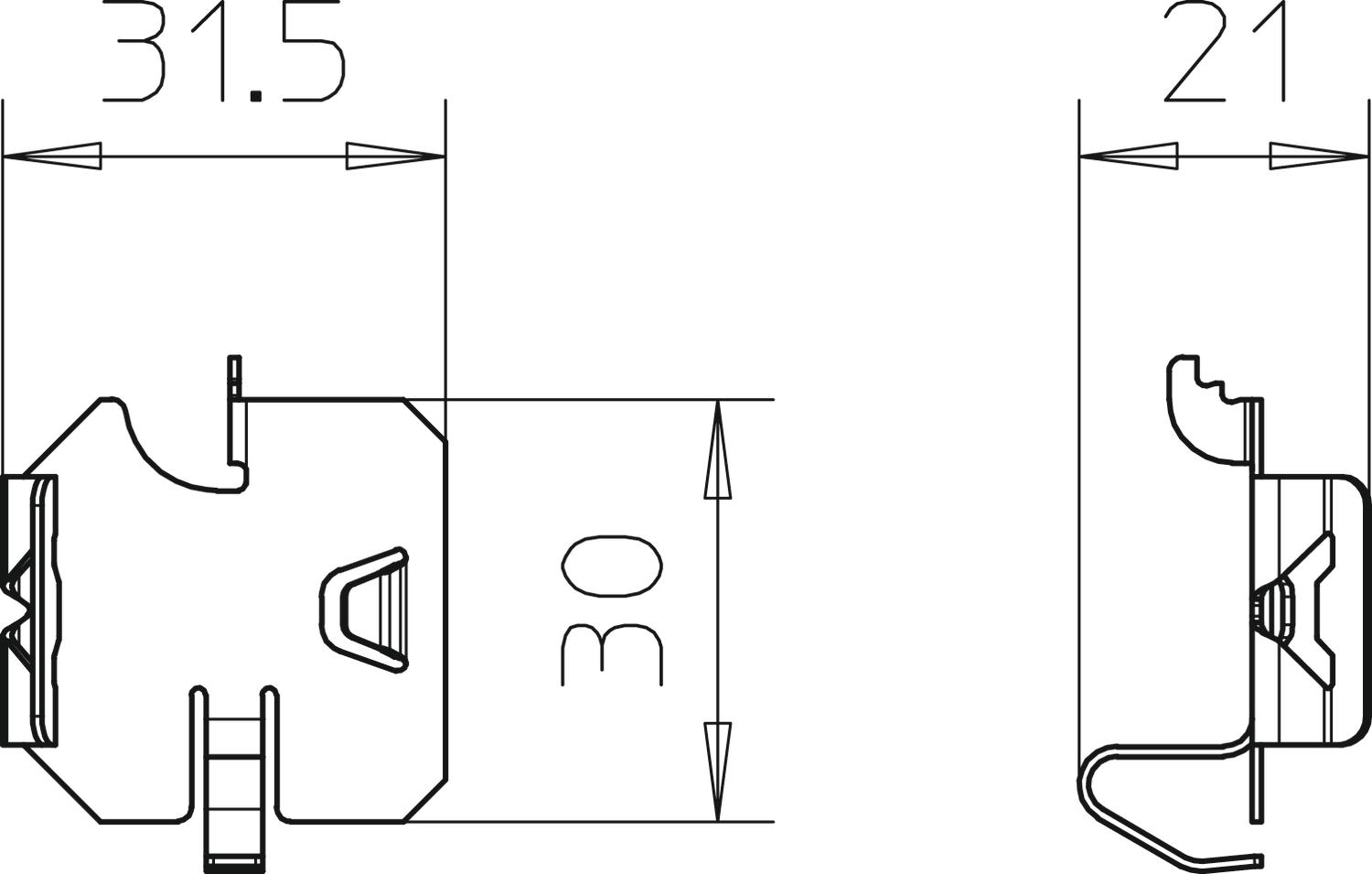 Descrição do produtoPeça de aperto para fixação, sem parafusos, de separadores em caminhos de cabos do tipo RKSM.