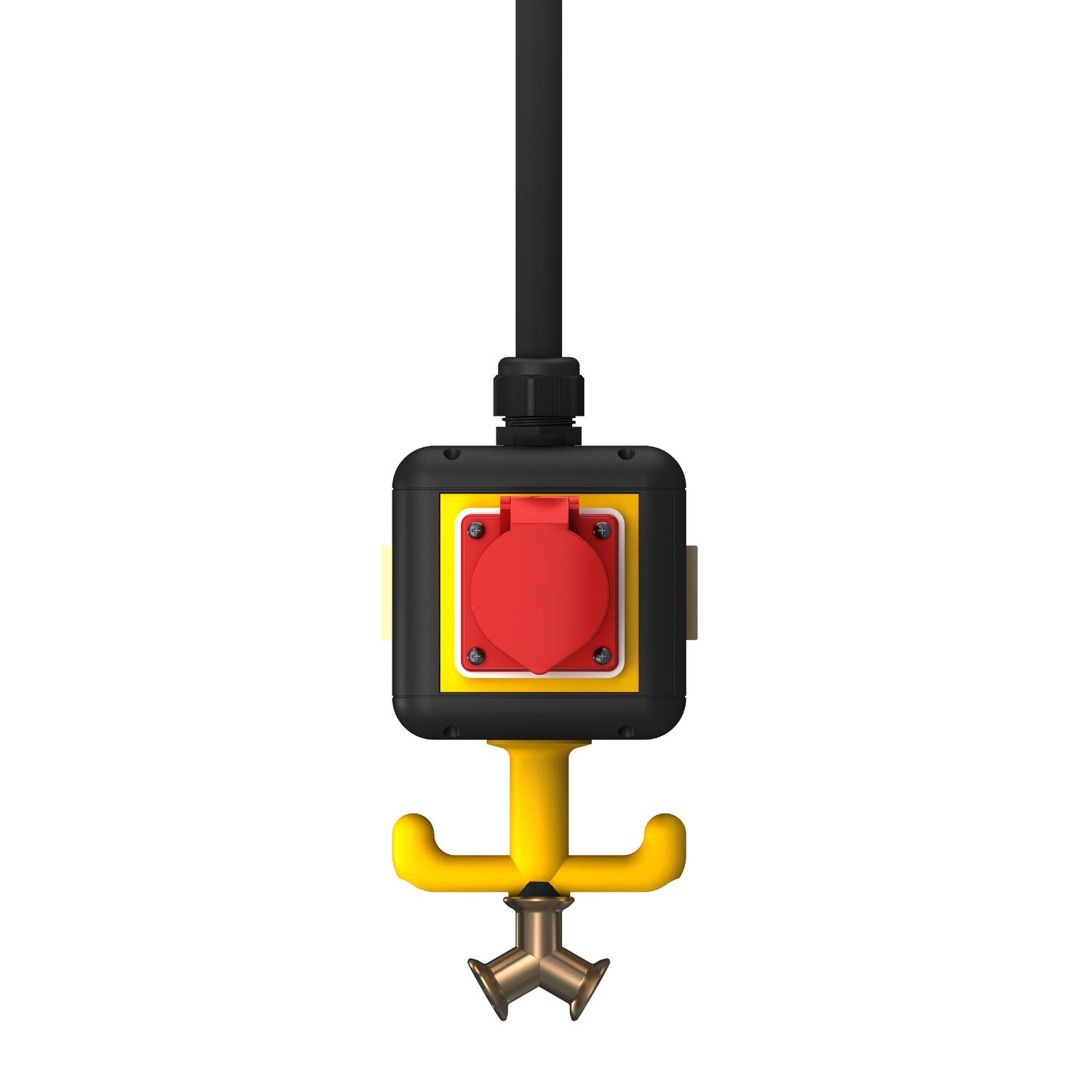 Descrição do produtoCaixa equipada e pré-cablada com tubo de 1 m e 1/2", ligação para tubo flexível de ar comprimido de 13 x 3,5 mm e distribuidor de 2 vias de 1/2", com olhal de suspensão, gancho e 4 espelhos.