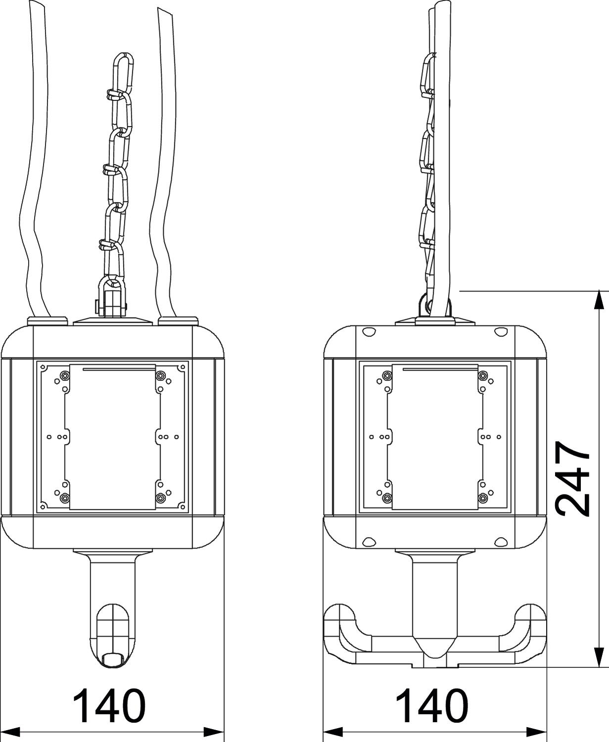 Descrição do produtoCaixa vazia com olhal de suspensão e gancho, para a montagem de 4 equipamentos eléctricos, com separador fornecido. Sem espelhos.