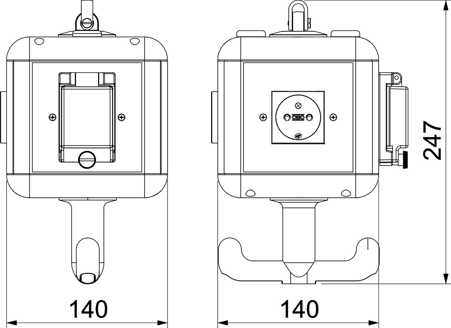 2 x tomadas simples de 16 A/250 V com proteção contra choque reforçada, pré-cabladas num circuito de corrente alternada, ligação através de 1 x borne de 3 polos, com separador para a divisão dos circuitos de corrente e um interruptor FI/LS.