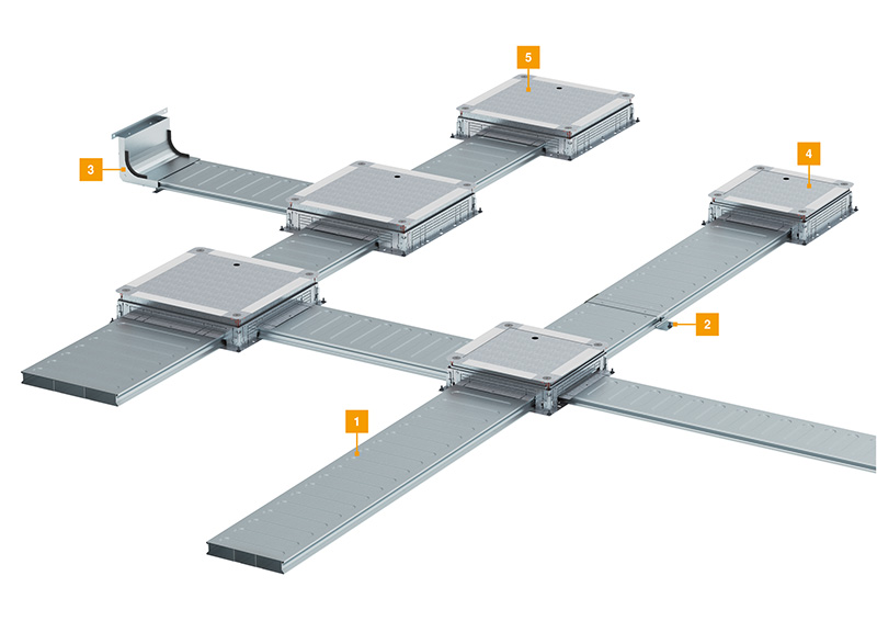 O sistema de calhas de pavimento EÜK são a solução de chão ideal para grandes áreas com planos fixos para o mobiliário, por exemplo em edifícios de escritórios ou de administração. Garante um elevado grau de flexibilidade para a alimentação elétrica, a partir do pavimento, sendo constituído por uma caixa (UZD ou UGD) e uma calha EÜK também de duas peças. Isto facilita claramente a instalação de calhas e a colocação de cabos.