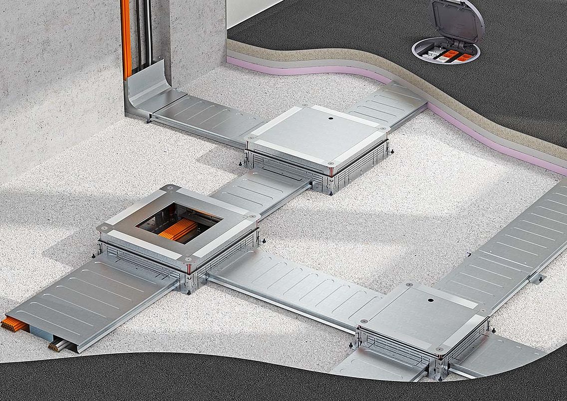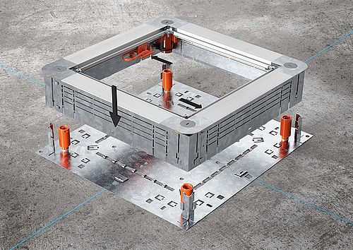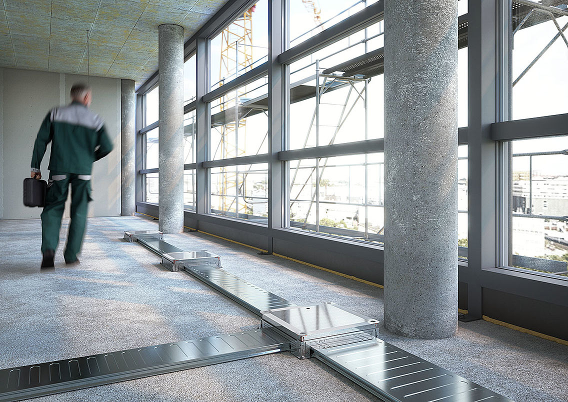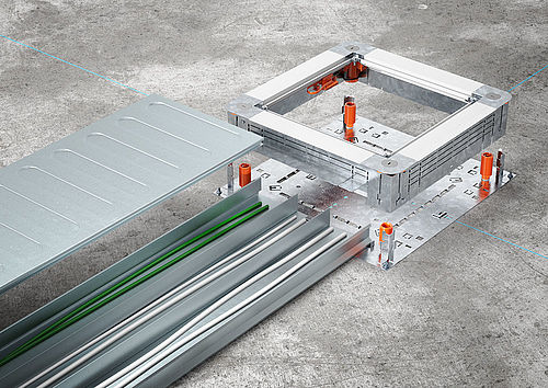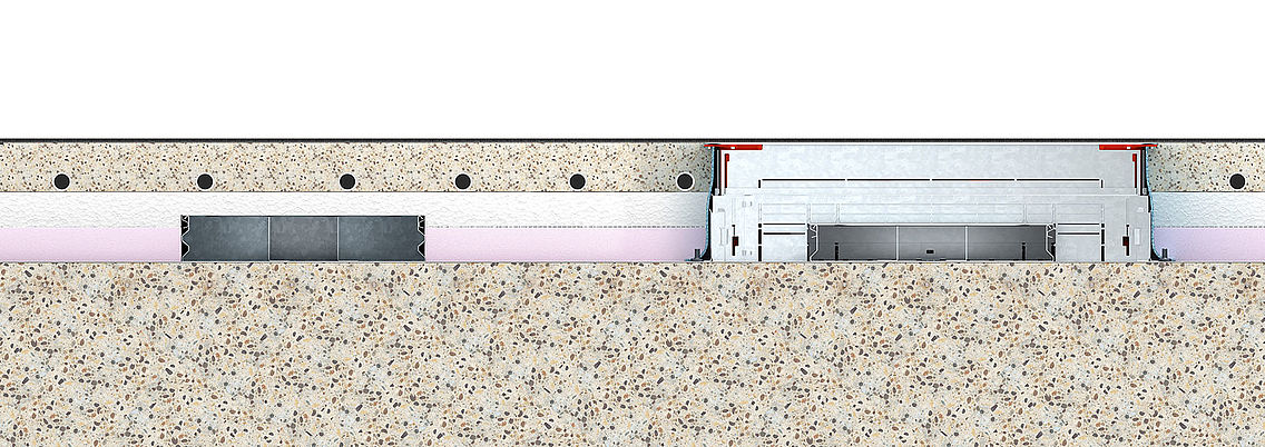 O robusto sistema mostra os seus pontos fortes durante a fase de construção. Este está sempre completamente fechado durante toda a montagem. As caixas de pavimento são protegidas pela tampa de proteção de montagem. Deste modo, nenhum corpo estranho pode entrar no sistema e o espaço interior permanece limpo. No seu estado normal, as caixas cobrem uma vasta amplitude de nivelamento, de 80 a 160 mm de altura de pavimento. Outra vantagem: podem ser desacopladas para que as caixas de pavimento flutuem no pavimento. Este desacoplamento evita fissuras no piso e no revestimento do pavimento adjacente.