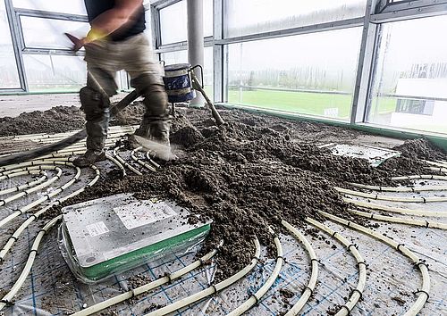 As calhas e as caixas de pavimento do sistema EÜK da OBO são instaladas diretamente sobre o betão bruto. Para proteção contra perdas de calor e a redução do ruído de impacto, são utilizadas camadas de isolamento. Estas camadas de isolamento envolvem totalmente as calhas. Também é possível uma combinação com piso radiante no pavimento. Neste caso, as calhas encontram-se por baixo do aquecimento do pavimento e, como tal, completamente separadas da camada de isolamento.