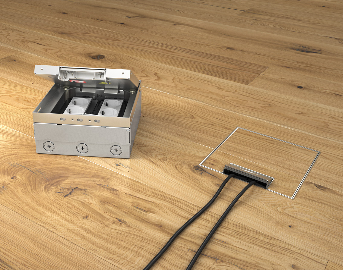 Com uma amplitude de nivelamento de até 30 mm, a UDHOME4 pode ser ajustada ao nível do pavimento acabado sem dificuldades. Mesmo durante a instalação dos aparelhos, a caixa de pavimento mostra-se flexível: pode ser equipada de forma flexível com 4 aparelhos com anel de suporte ou 6 aparelhagens Modul 45® com ligações para energia, dados e multimédia.