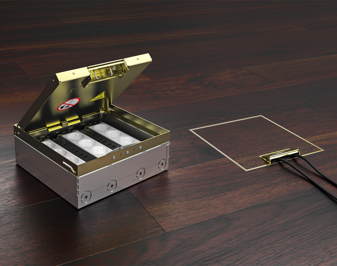 Tal como a UDHOME4 a caixa de pavimento UDHOME9 também está disponível com diferentes pré-configurações. Para requisitos específicos do projeto, os espaços de instalação vazios do suporte universal podem ser complementados com tomadas adicionais ou conectores de dados e tecnologia multimédia, utilizando a extensa gama de produtos Modul45.
