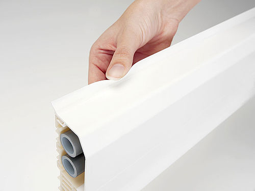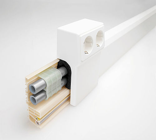 Devido à solução inteligente 2 em 1, tubos de aquecimento e tubos elétricos simplesmente são dispostos em simultâneo na base da calha. A perfuração de ranhura na base da calha torna a montagem ainda mais fácil.