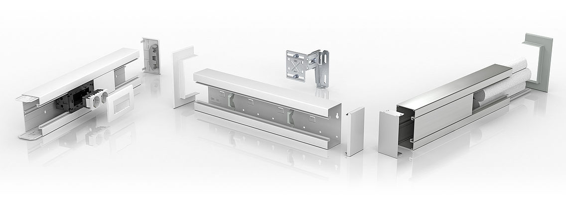 Design e funcionalidade combinados num sistema: Isto é a calha técnica Rapid 80. Devido à normalização consistente dos componentes de sistema, podem ser aplicados os três tipos de calhas em plástico, alumínio ou chapa de aço como variante individual ou combinadas entre si. Os acessórios rígidos e acessórios variáveis são compatíveis com todas as versões.