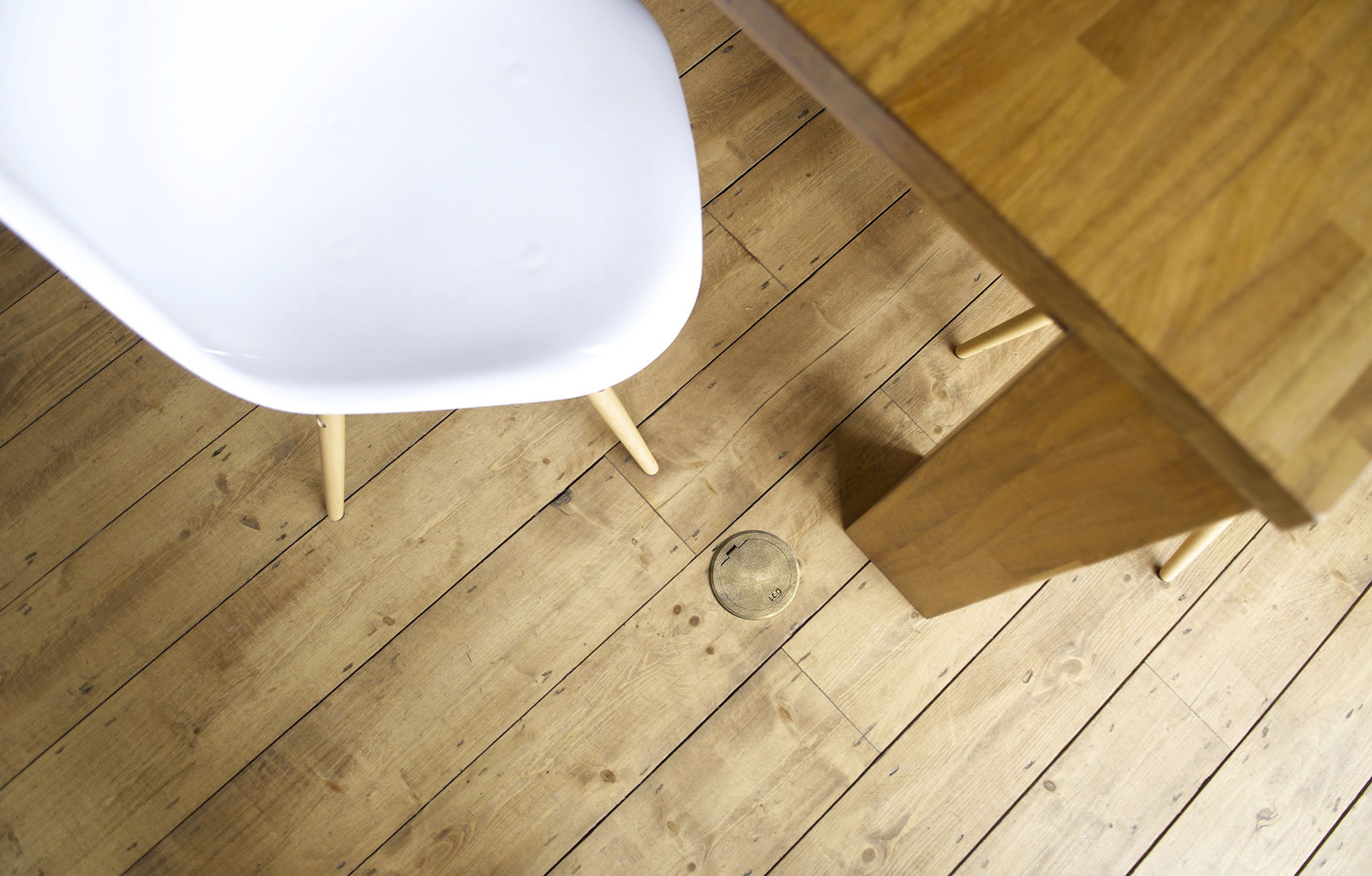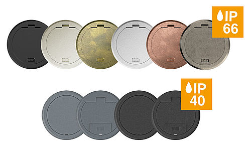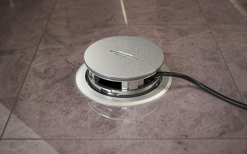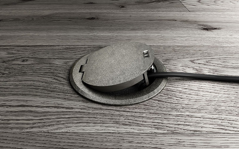 O fecho por encaixe da tampa basculante permite uma saída segura dos cabos. No estado fechado, a tampa de chão é até adequada para o tratamento a húmido. Esta versão da GES R2 está disponível nas cores latão antigo, cobre antigo, cromado, níquel, níquel oxidado e preto profundo.