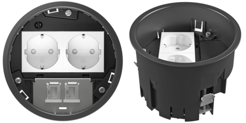 O suporte de aparelhos está disponível vazio ou pré-equipado. A variante pré-equipada inclui uma tomada dupla ou uma combinação, livremente selecionável, de dois aparelhos Modul 45. O suporte de aparelhos pré-equipado com a tomada dupla é particularmente adequado para aplicações padrão. A variante para duas unidades individuais Modul 45 providencia ainda mais flexibilidade de instalação: o espaço de instalação está separado nesta versão – isto permite a instalação simultânea de duas tomadas ou duas ligações multimédia tais como: HDMI, VGA ou conectores de dados.