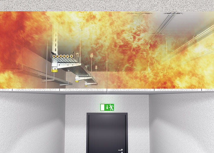 Para que as saídas de emergência e as zonas de evacuação se mantenham perfeitamente utilizáveis, a OBO oferece uma abrangente gama de sistemas testados. A estes pertencem ductos de proteção contra incêndios, suportes múltiplos, abraçadeiras de teto para cabos, caminhos de cabos em chapa e muito mais.
