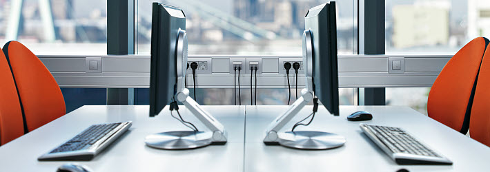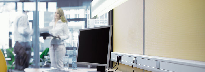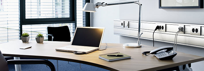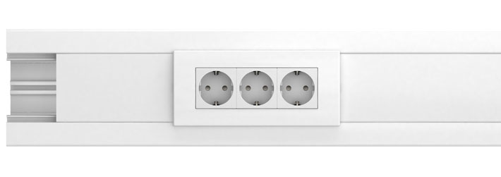 Os clássicos no escritório: calhas técnicas em plástico são uma boa seleção para instalações na parede. Montadas a uma altura confortável, estas possibilitam um acesso flexível e rápido à energia e aos dados. Os acessórios universais e acessórios ajustados de forma racional permitem uma montagem simples e rápida.