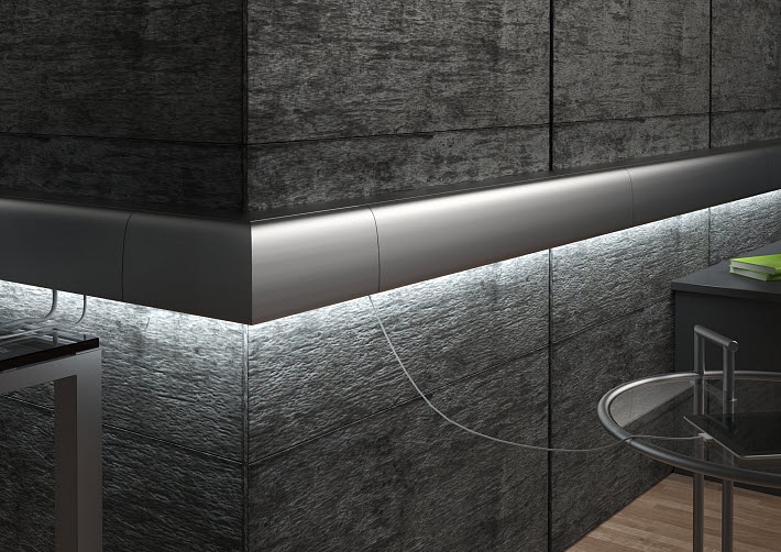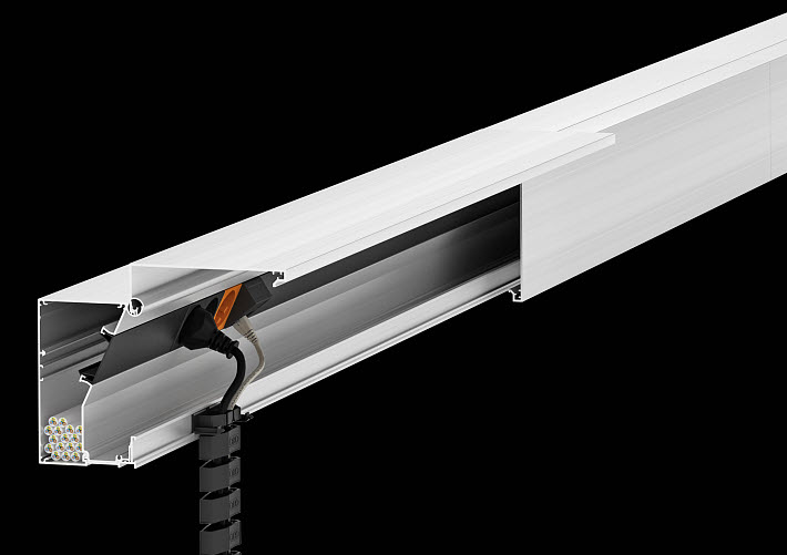 Na parte inferior do sistema de calhas pode ser opcionalmente montada uma barra luminosa LED. Esta garante uma iluminação discreta das paredes e superfícies sob o sistema de calhas.