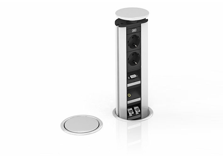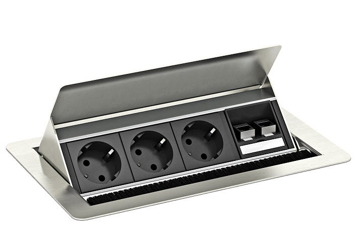 A Deskbox retrátil permite uma alimentação discreta de energia e de dados. Se estiver fechada sobre a superfície da mesa é extremamente plana e discreta. No entanto o funcionamento interno é completo, estando disponíveis inúmeras possibilidades de configuração.