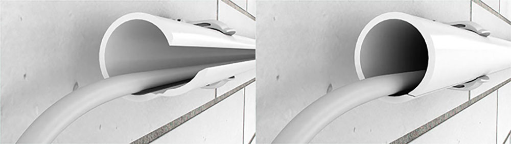 A aplicação do sistema Quick-Pipe é tão simples como isto: os cabos são inseridos nos tubos de instalação elétrica Quick-Pipe abertos, da mesma forma que numa calha para cabos aberta. Depois de os cabos serem inseridos, o Quick-Pipe é rodado na abraçadeira Quick e é fechado de forma automática por este simples movimento. O mecanismo rotativo assegura também que são possíveis instalações posteriores a qualquer momento e sem qualquer problema. O Quick-Pipe pode ser de novo aberto, muito facilmente, ao ser rodado.
