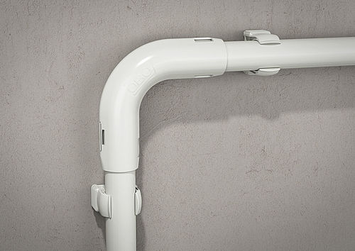 Com a sua forma especial, o ângulo de 90° Quick Pipe adequa-se perfeitamente a instalações de canto interiores e exteriores. Garante uma colocação dos tubos em ângulo reto. Também dispõe de uma dobradiça que assegura uma instalação particularmente fácil.