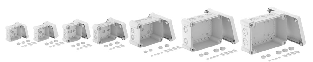 As caixas de derivação da série X podem suportar mesmo as cargas mecânicas mais elevadas. Contudo, a série X impressiona não apenas pela sua robustez, mas também pelo seu design funcional e bem planeado. As caixas de derivação da série X estão disponíveis em duas versões: com entradas quebraveis e com paredes lisa. Diferentes dimensões providenciam o tamanho perfeito para cada aplicação.