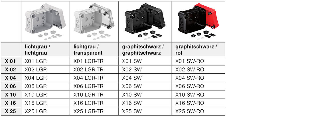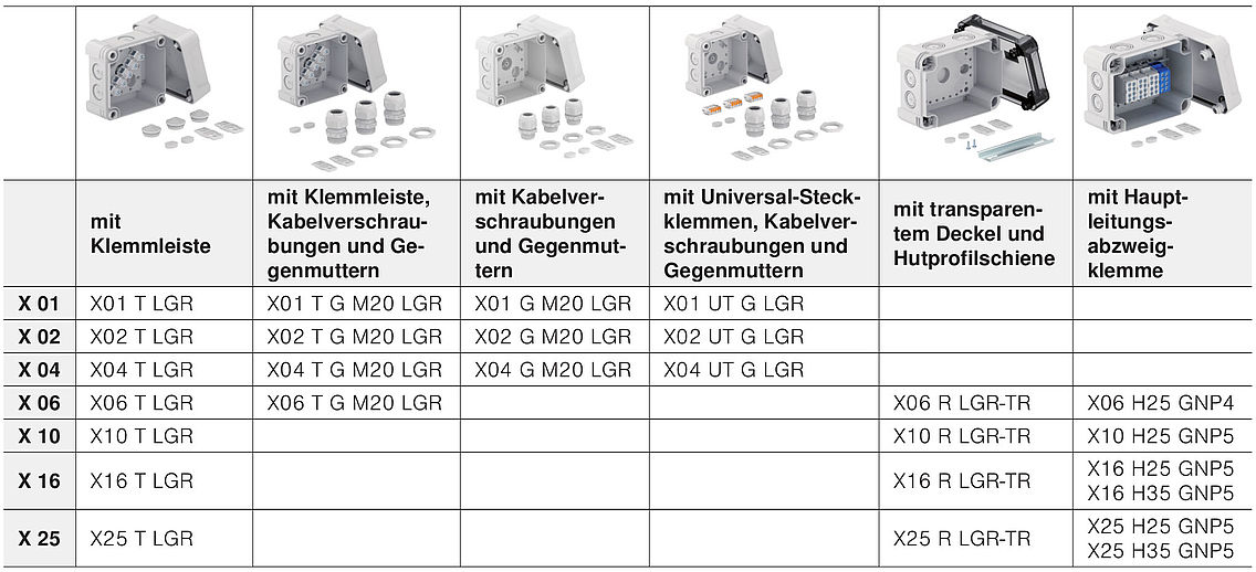 A série X está disponível em diferentes configurações. Por exemplo, estão disponíveis gamas completas pré-instaladas com ligador terminal da linha principal, bucins com porcas, réguas de bornes e calhas DIN. Contudo, no volume de fornecimento de todas as caixas de derivação estão sempre incluídas tampas com parafusos, vedações de encaixe e elementos de fixação exteriores. Adicionalmente, a série X disponibiliza uma vasta gama de acessórios.