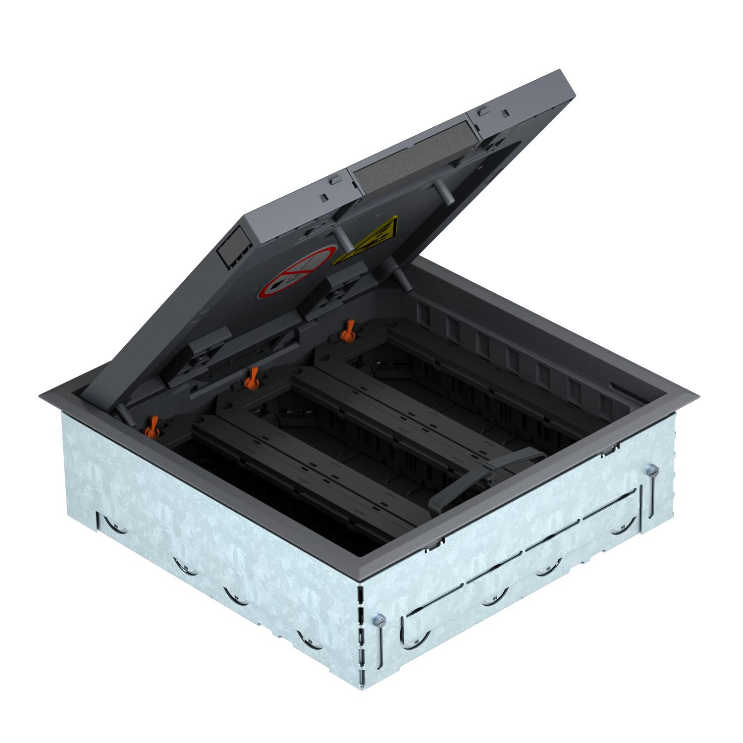 Descrição do produtoConjunto quadrado com saída de cabos para o uso em chão falso e pavimentos de betonilha de limpeza a seco, composta por caixa de pavimento e tampa de encastramento GES9-3 (cor cinzento; RAL 7011) com dois suportes universais UT4. Caixa de pavimento com pré-cortes para tubagens (M25), ajustável à aresta superior da betonilha. No estado de entrega a caixa de pavimento está fechada com uma tampa cega. A tampa de encastramento pode ser inserida na abertura de montagem resultante após trabalhos no pavimento. Entalhe de revestimento em tampa basculante de 3, 5, 8 ou 10 mm.