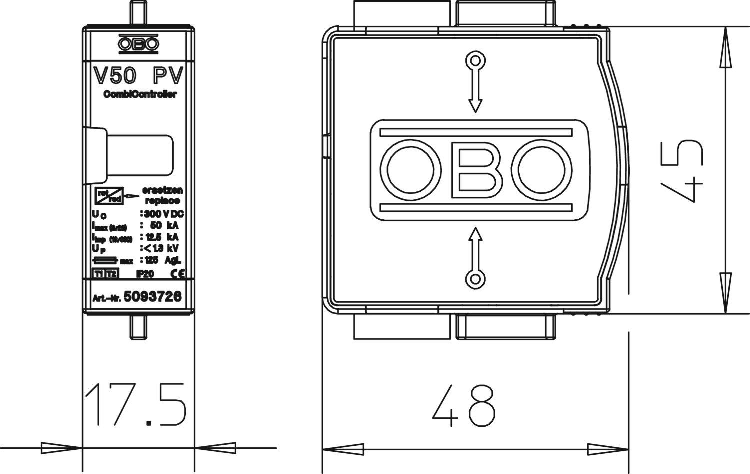Descrição do produtoMódulo de substituição, descarregador combinado tipo 1+2 para sistemas fotovoltaicos