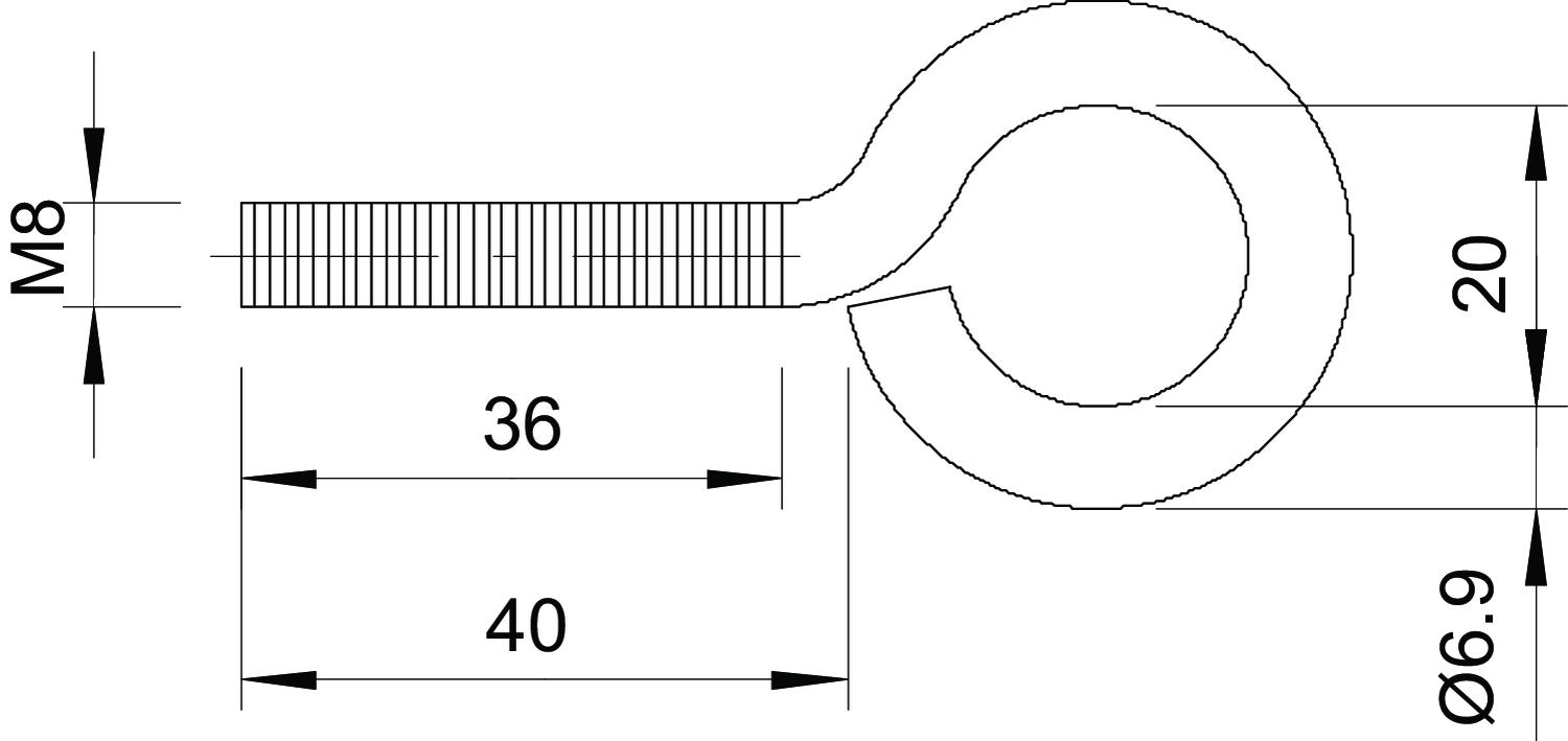 Carga de rutura 2 kN Comprimento 70 mm Comprimento da haste 40 Comprimento da rosca 36 mm Diâmetro do gancho 20 mm Dimensão M8x40mm Material Aço Revestimento plástico não Rosca M8 Superfície eletrogalvanizado - Todos os tipos