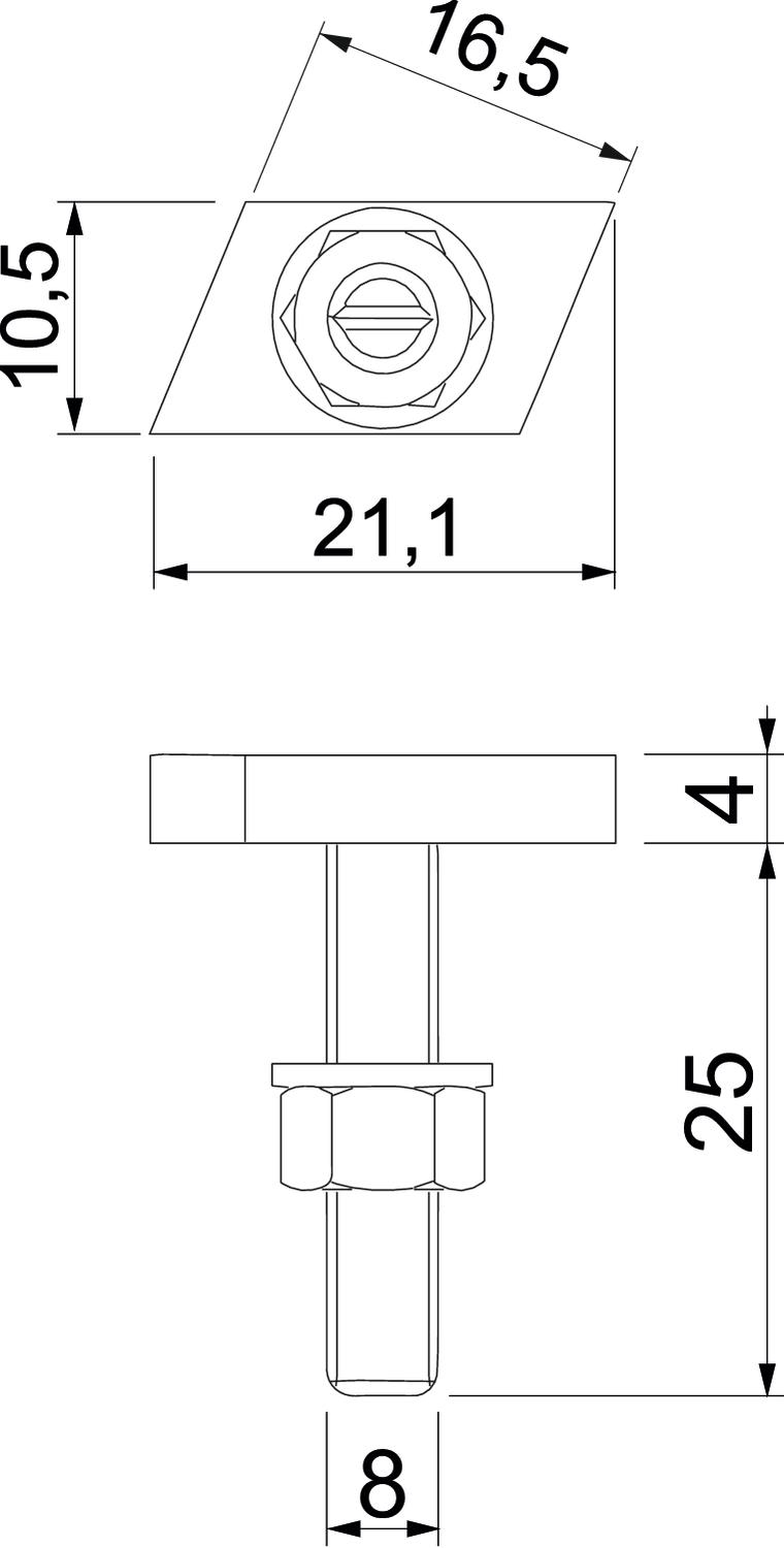 Adequado para perfil de montagem sim Altura 4 mm Comprimento 21,1 mm Dimensão M8x25mm Largura 10,5 mm Material Aço Medida L 25 mm Pegada de CO2 (GWP) do berço ao portão 0,0565 kg CO2e / 1 Peça Rosca M 8 x 25mm Rosca métrica 8 Superfície Lamela de zinco - Todos os tipos