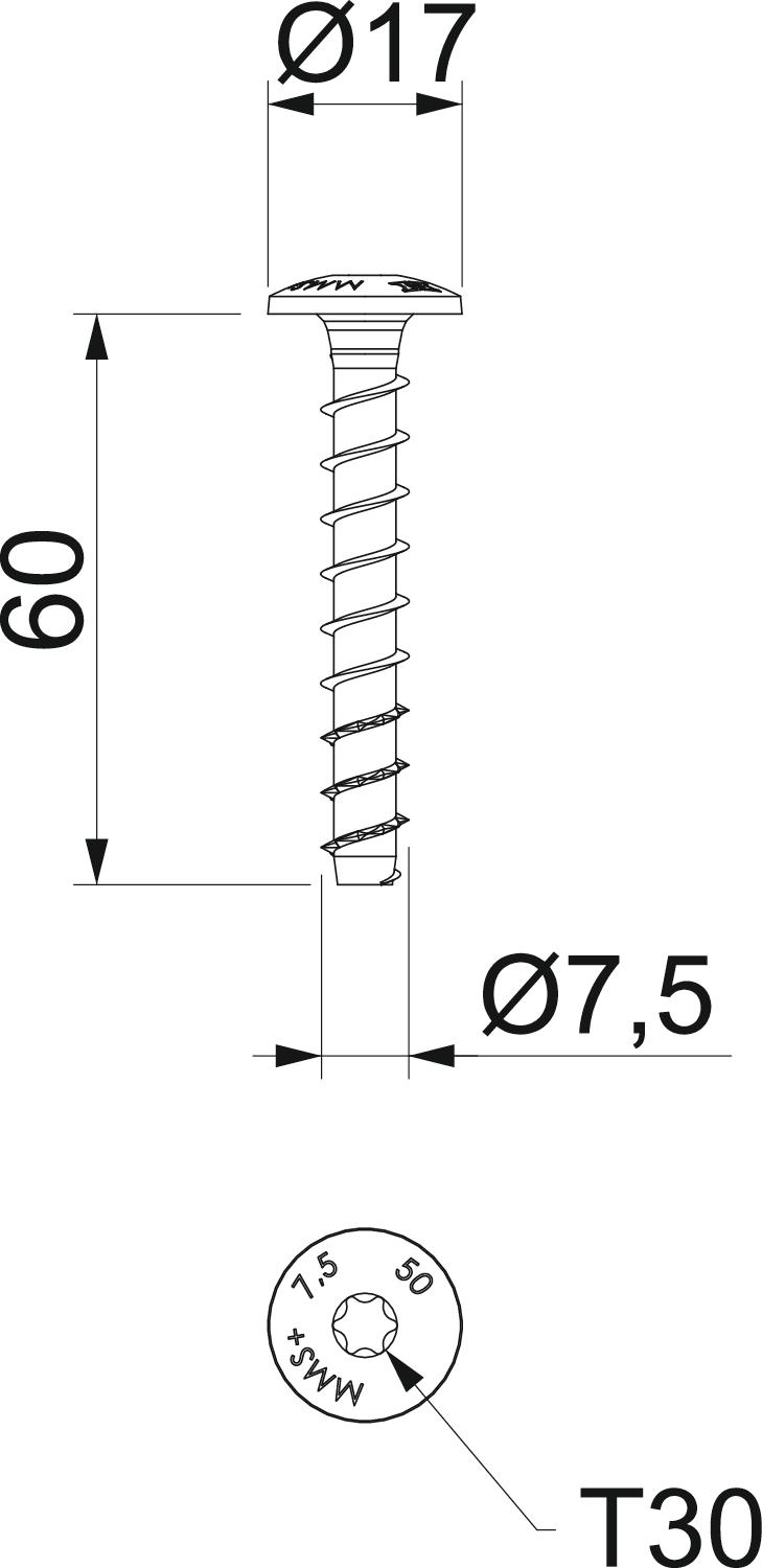 Amplitude dos terminais 25 mm Comprimento 60 mm Comprimento da bucha 60 mm Cor zinco Diâmetro da cabeça 17 mm Diâmetro da rosca ST 7,5 Diâmetro de perfuração mín. 6 mm Dimensão 7,5 x 60 Dimensão 7,5x60 Endurecido sim Fire resistance class EN 13501-1 R30, R60, R90, R120 Formato da cabeça Cup head Material Aço Medida L 60 mm Parafusos Torx Profundidade do furo 40 mm Rosca 7,5 Superfície galvanizado - Todos os tipos