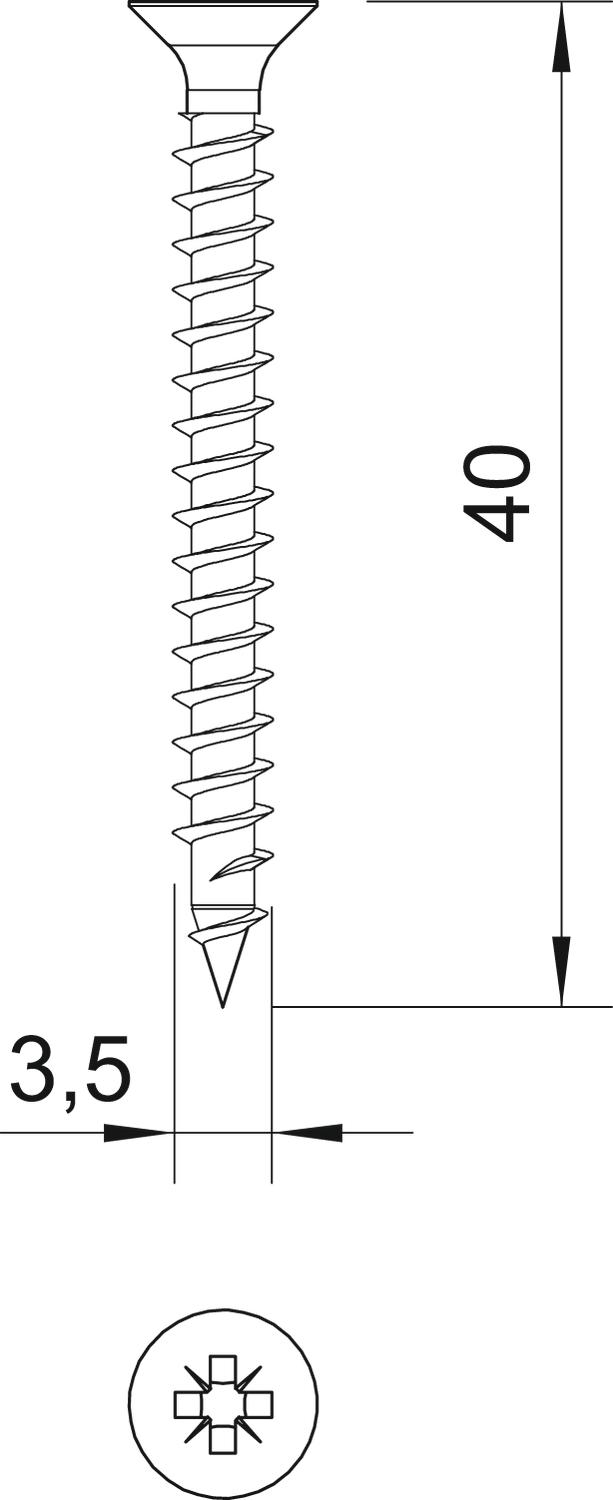 Comprimento 40 mm Diâmetro da cabeça 6,5 mm Dimensão 3,5x40mm Endurecido sim Formato da cabeça Cabeça embutida Material Aço Medida D 3,5 mm Medida L 40 mm Parafusos Pozidriv PZ Superfície eletrogalvanizado - Todos os tipos