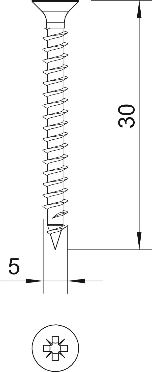Comprimento 30 mm Diâmetro da cabeça 9,2 mm Dimensão 5x30mm Endurecido sim Formato da cabeça Cabeça embutida Material Aço Medida D 5 mm Medida L 30 mm Parafusos Pozidriv PZ Superfície eletrogalvanizado - Todos os tipos