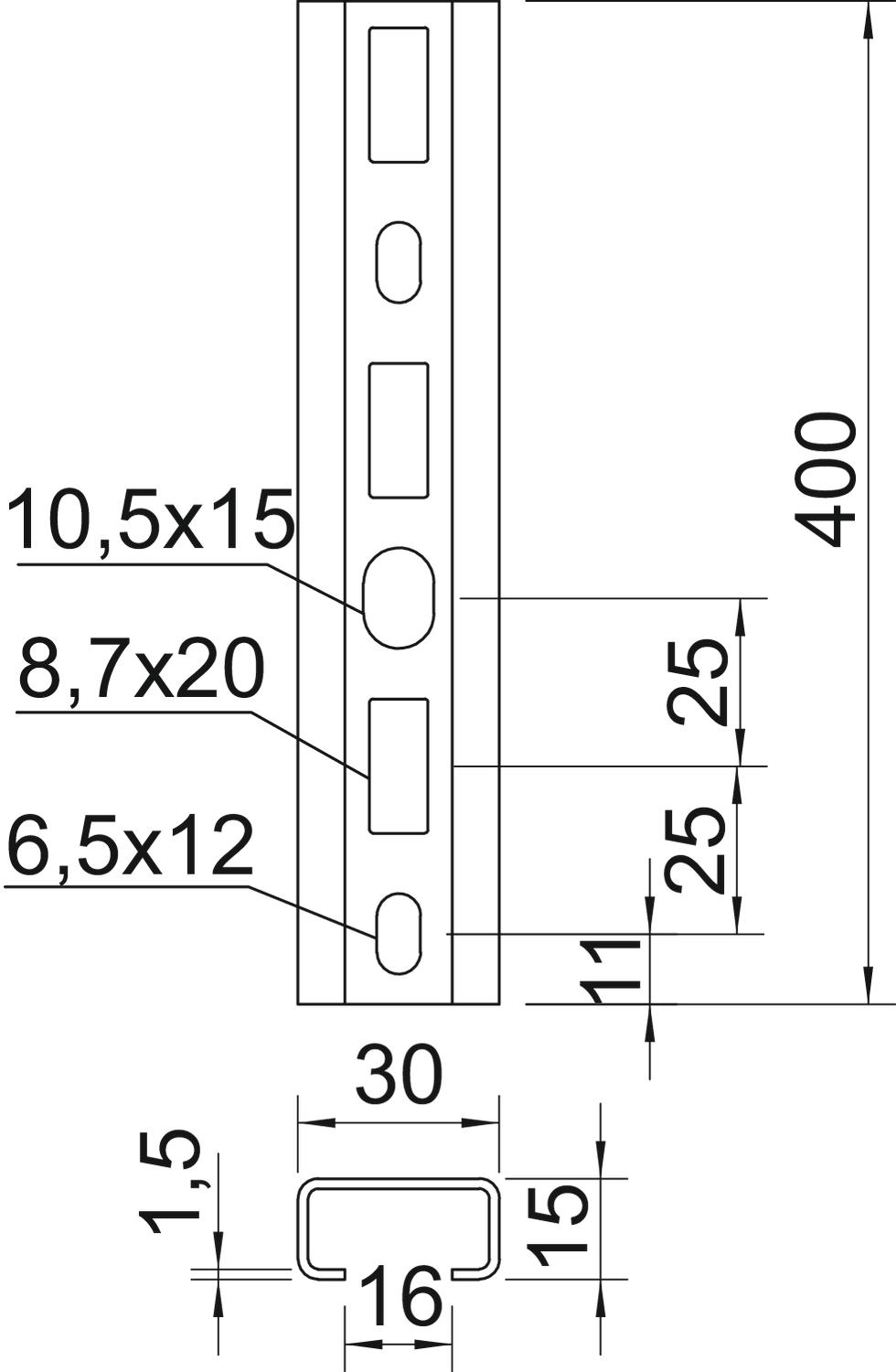 Altura 15 mm Com engrenagem não Com perfuração sim Com pré-cortes não Comprimento 400 mm Dimensão 400x30x15 Distância cêntrica entre os furos 25 mm Espessura do material 1,5 mm Forma do perfil Perfil C Funktionsgaranti não Largura 30 mm Largura de rasgo 16 mm Material Aço Medida L 400 mm Pegada de CO2 (GWP) do berço ao portão 0,6563 kg CO2e / 1 Peça Superfície Galvanizado por imersão a quente após maquinação Tipo de perfuração Parte traseira perfurada Valor estático A 0,8 cm² Valor estático ly 0,24 cm⁴ Valor estático lz 1,22 cm⁴ Valor estático Wy 0,29 cm³ Valor estático Wz 0,81 cm³ Versão Perfil simples - Todos os tipos