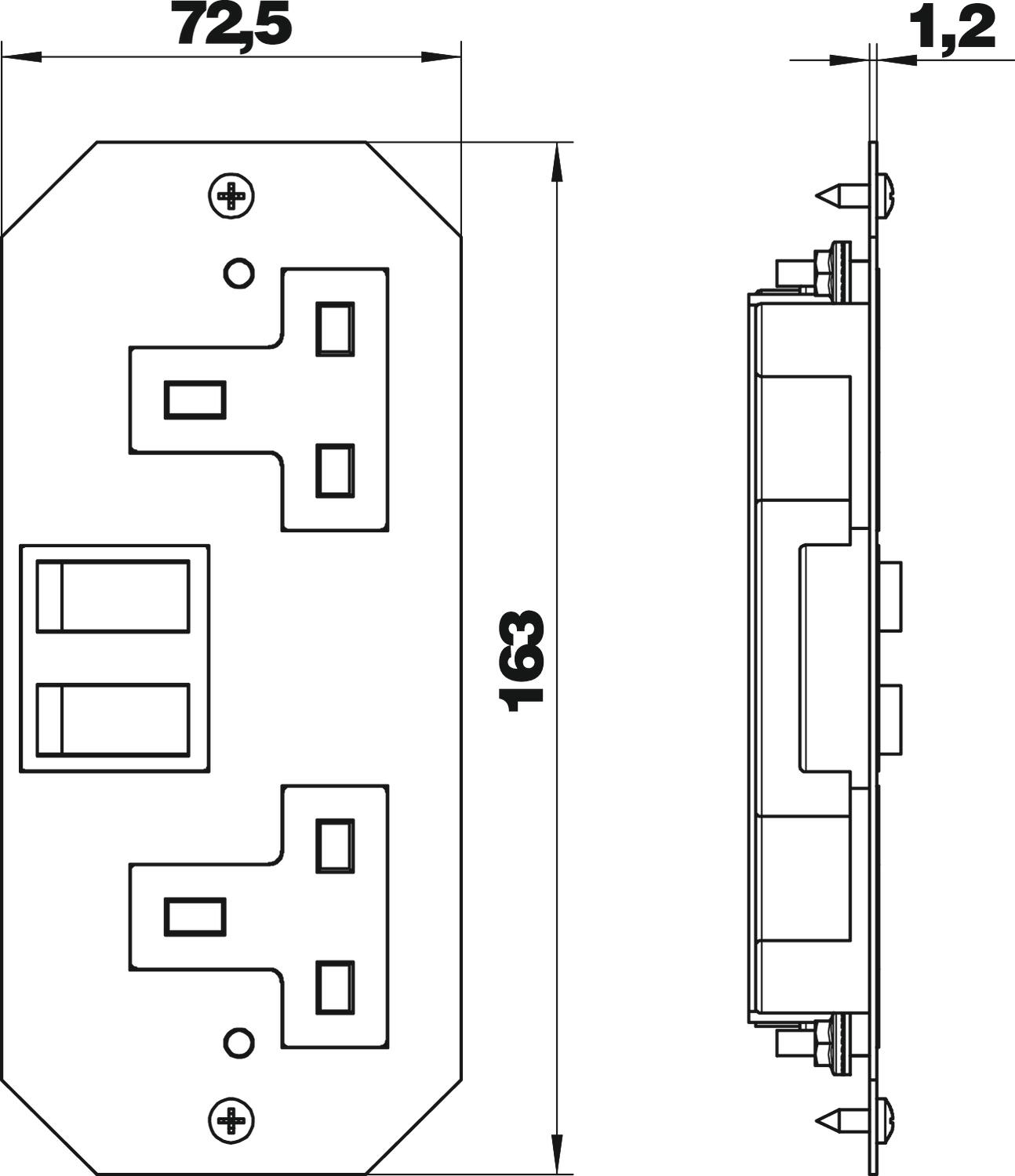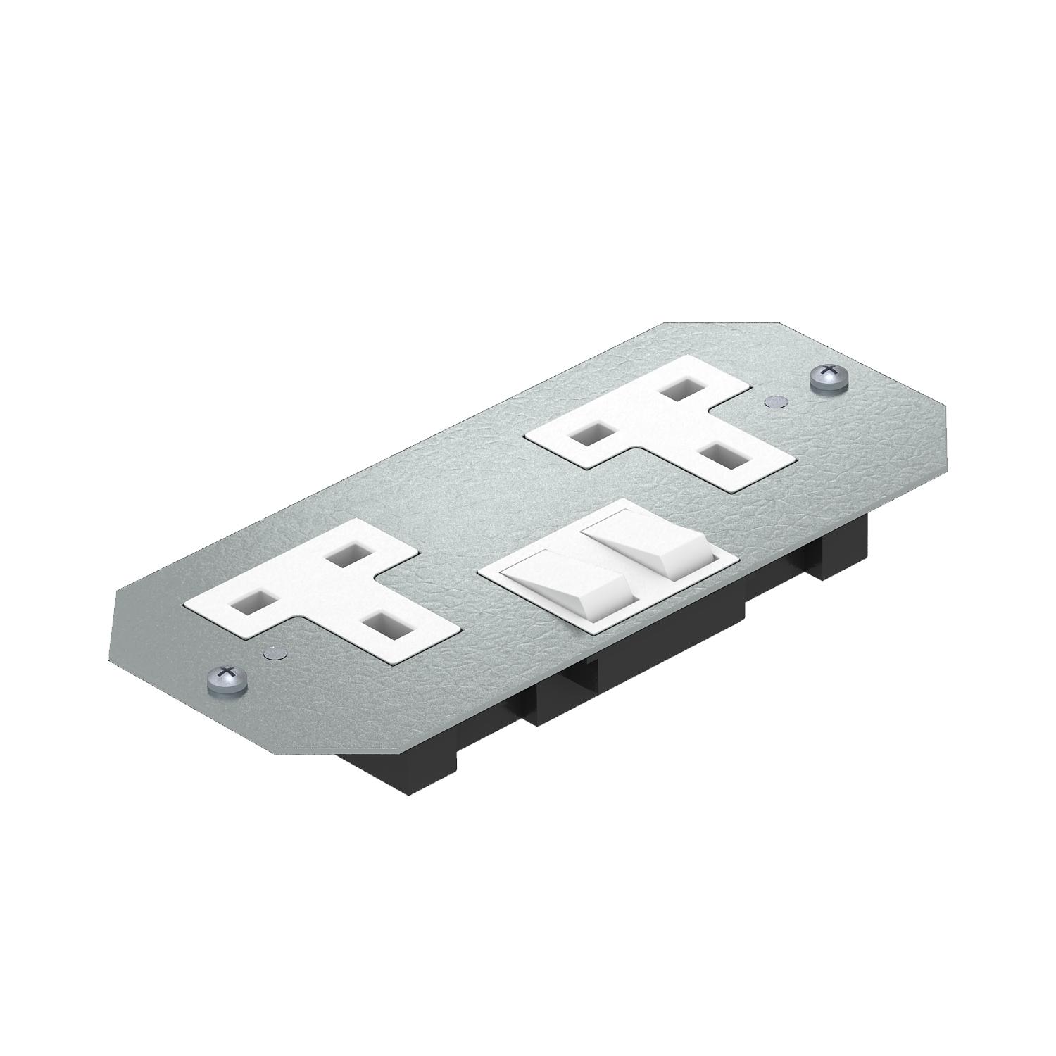 Descrição do produtoPlaca de suporte com uma tomada dupla comutada para montagem em aro de redução por baixo de tampas GES e caixas.
