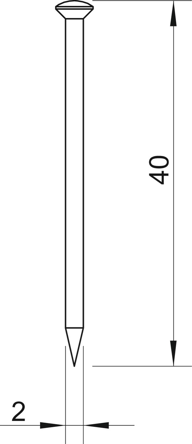 Comprimento 40 mm Diâmetro da haste 2 mm Dimensão 2x40mm Endurecido sim Formato da cabeça Cabeça lenticular Material Aço Medida d 2 mm Medida L 40 mm Superfície eletrogalvanizado Versão Prego Versão prego roscado não - Todos os tipos
