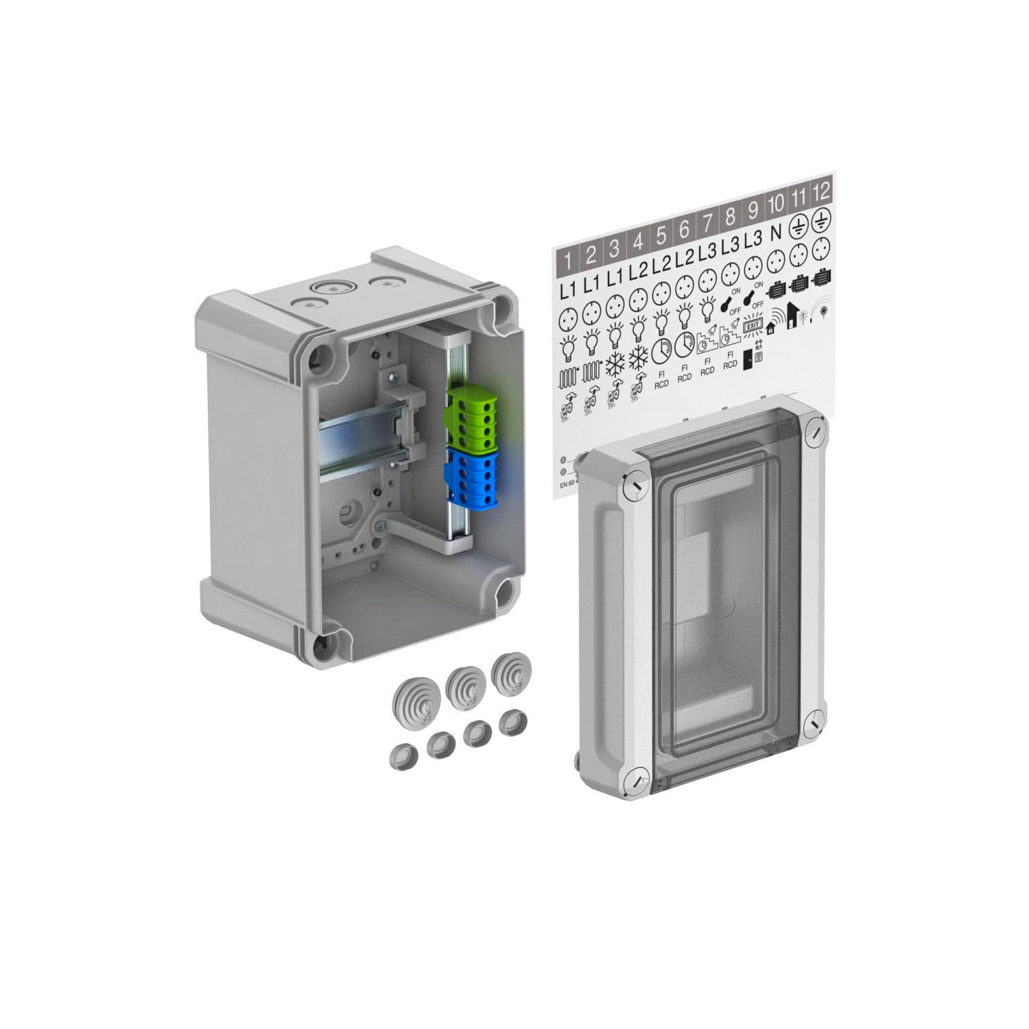 Descrição do produtoQuadro de distribuição com régua de bornes para montagem à superfície, para sub-distribuição de energia em área interior e área exterior protegida, de acordo com a IEC 439-3. Com calha DIN de 35 mm pré-montada. Classe de proteção IP66 e grau de proteção IK07. Tampa transparente para aparafusar, com recorte.