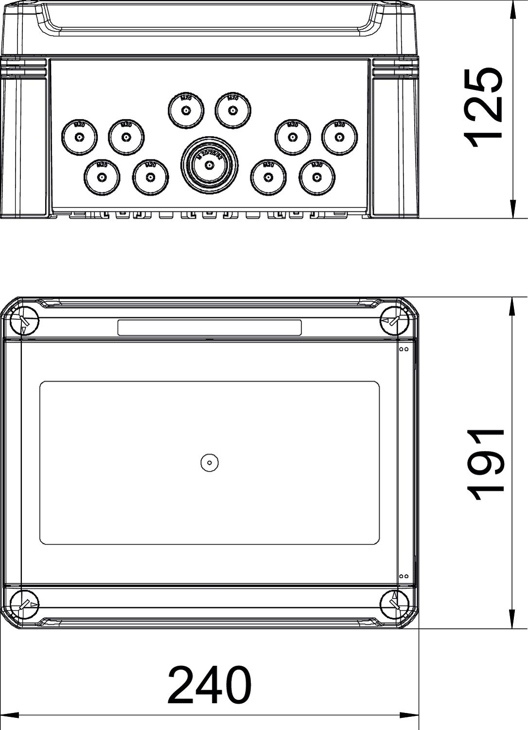 Quadro de distribuição de montagem saliente, com isolamento de proteção para, no máximo, 9 módulos. Na parte superior e inferior, 9 entradas destacáveis (8x Ø20 e 1x Ø20/25/32) incl. calha DIN pré-montada de 35 mm. Os quatro parafusos da tampa garantem o isolamento.