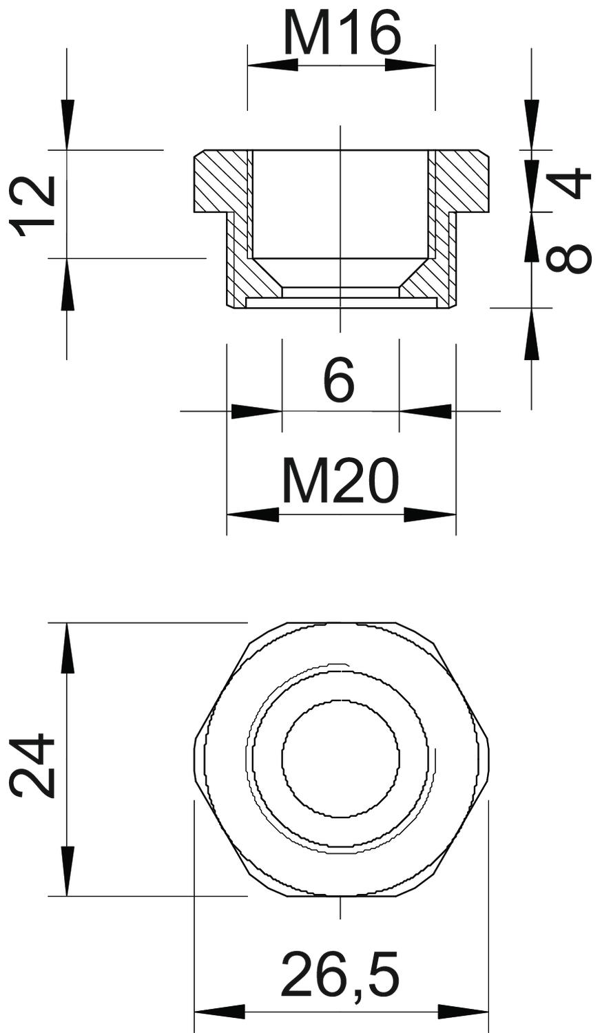 Descrição do produtoRedução com rosca métrica interna e externa para a montagem de bucins plásticos em caixas. Grau de proteção IP54 sem vedação de ligação adicional. Grau de proteção até IP68 possível com vedação de ligação adicional, por exemplo, o-ring ou anel de vedação plano.