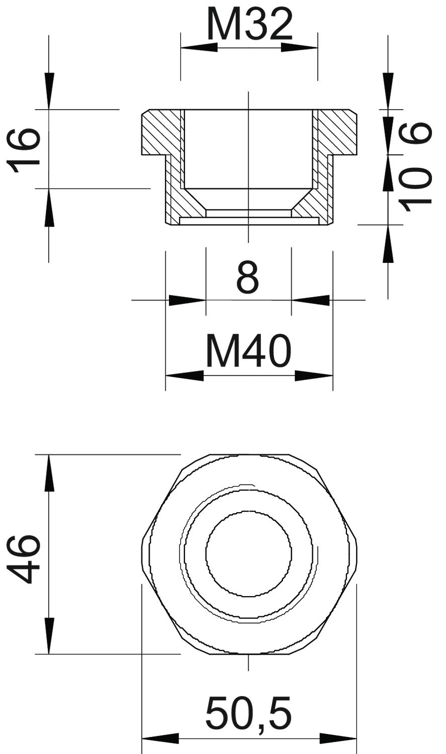 Descrição do produtoRedução com rosca métrica interna e externa para a montagem de bucins plásticos em caixas. Grau de proteção IP54 sem vedação de ligação adicional. Grau de proteção até IP68 possível com vedação de ligação adicional, por exemplo, o-ring ou anel de vedação plano.