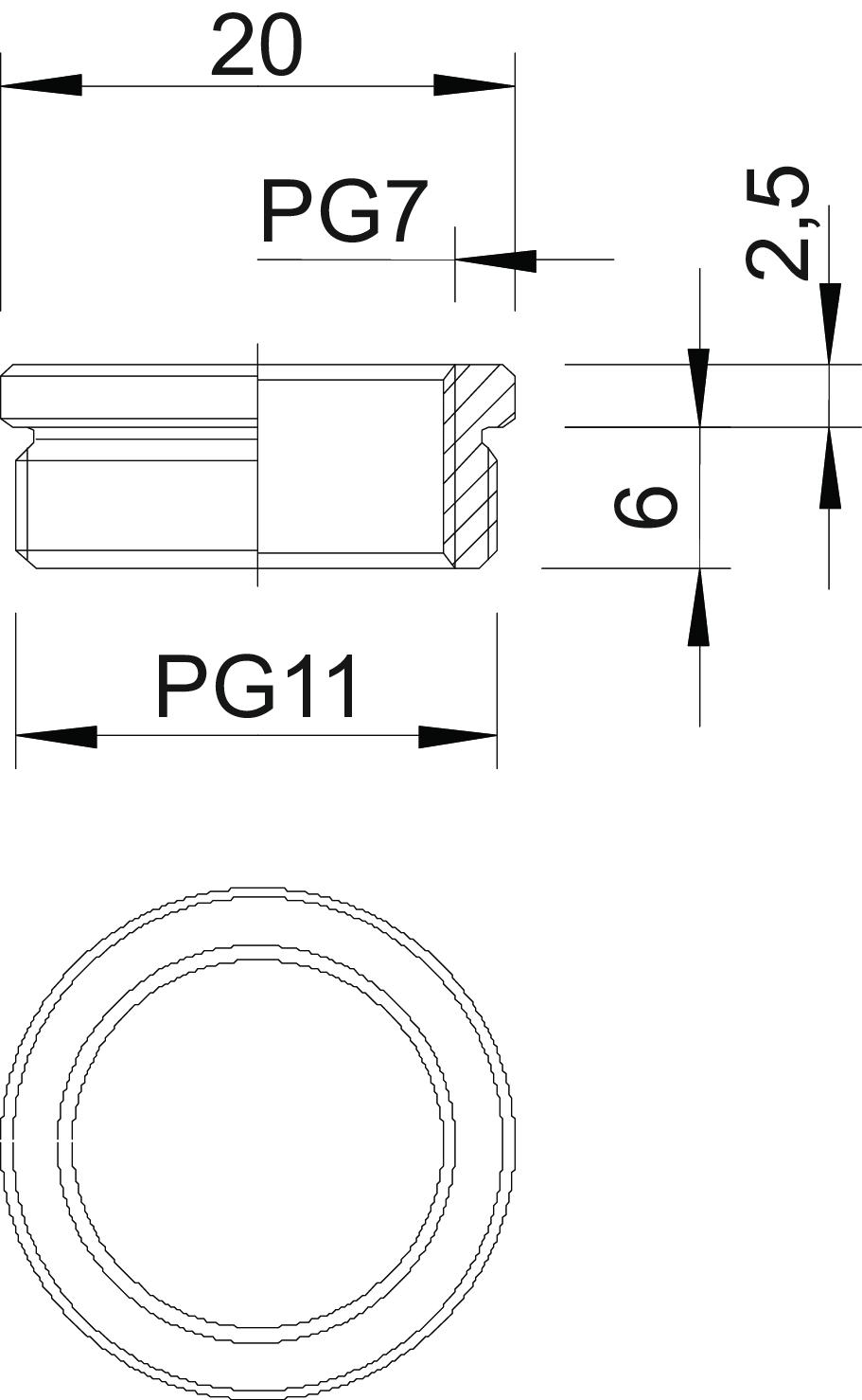 Descrição do produtoRedução (peça H) conforme a norma DIN 46320, com rosca PG conforme DIN 40430, para a transição de um furo roscado PG para um bucim mais pequeno.