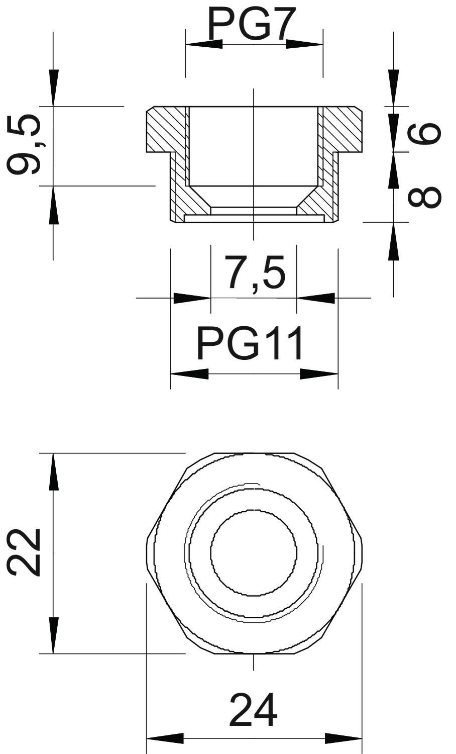 Descrição do produtoRedução com rosca PG interna e externa, conforme a DIN 40430, para a montagem de bucins plásticos em caixas. Grau de proteção IP54 sem vedação de ligação adicional. Grau de proteção até IP68 possível com vedação de ligação adicional, por exemplo, o-ring ou anel de vedação plano.