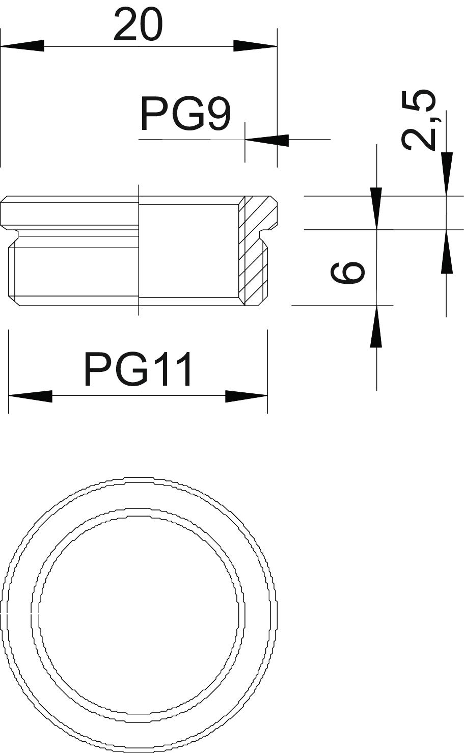 Descrição do produtoRedução (peça H) conforme a norma DIN 46320, com rosca PG conforme DIN 40430, para a transição de um furo roscado PG para um bucim mais pequeno.