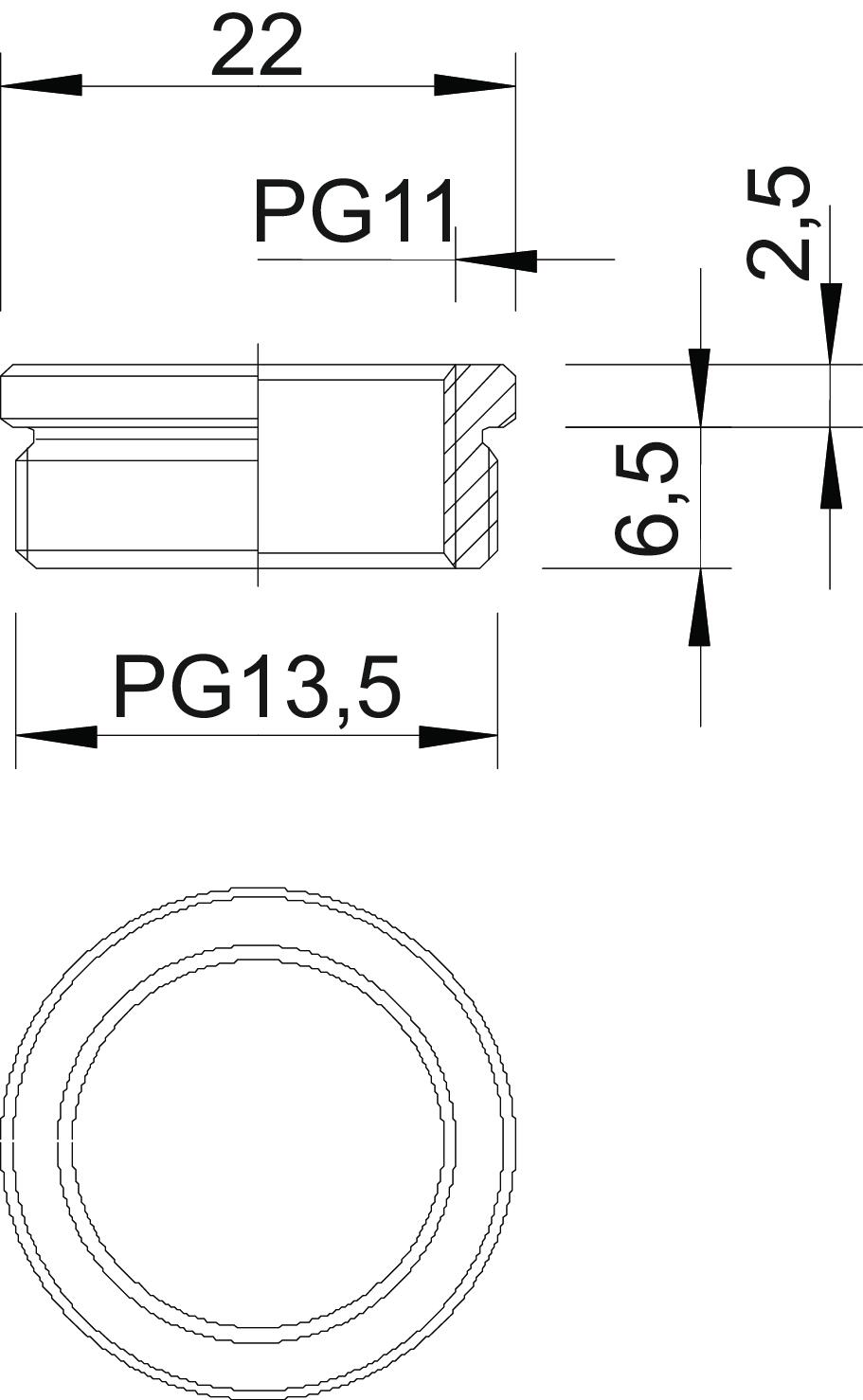 Descrição do produtoRedução (peça H) conforme a norma DIN 46320, com rosca PG conforme DIN 40430, para a transição de um furo roscado PG para um bucim mais pequeno.