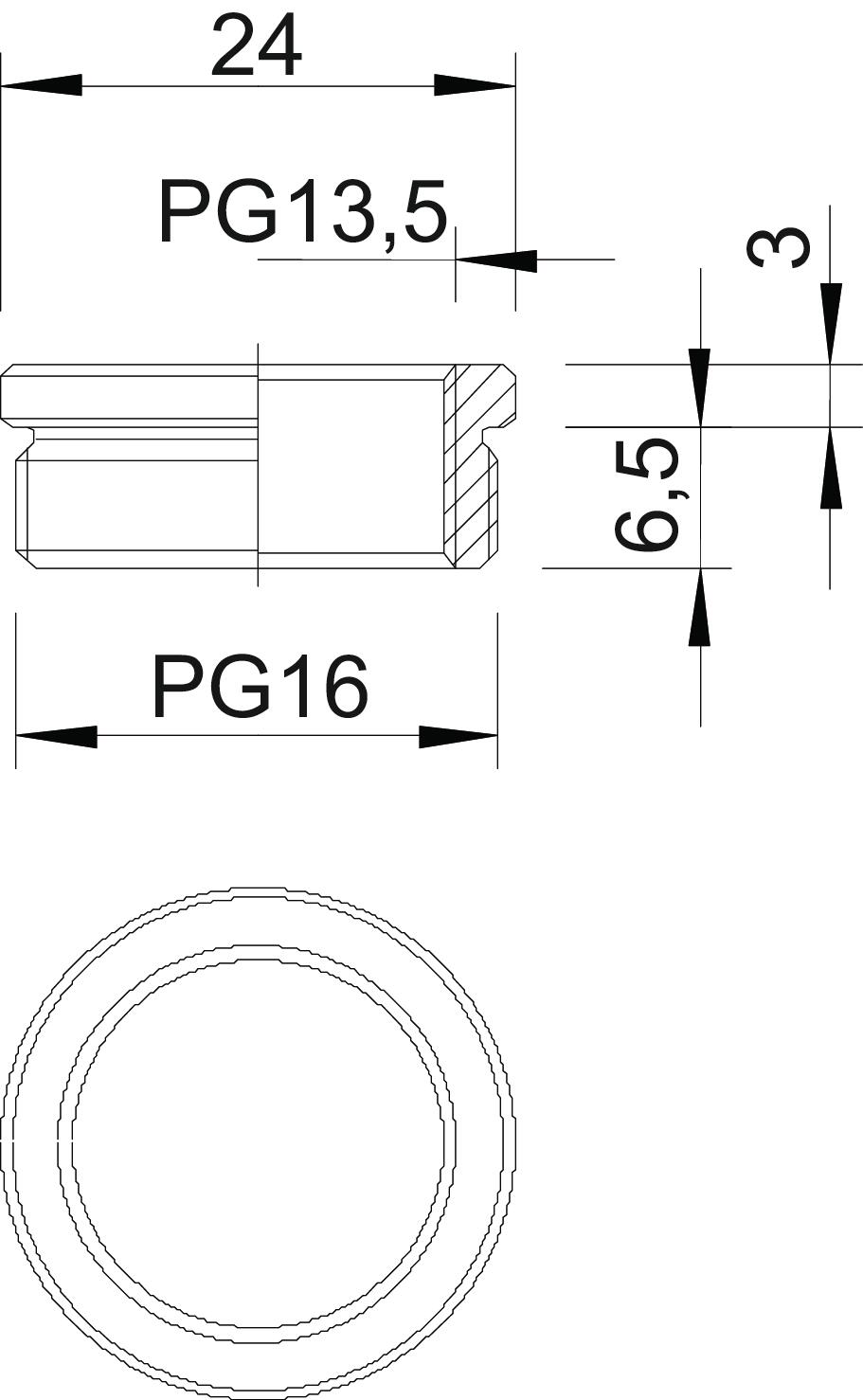 Descrição do produtoRedução (peça H) conforme a norma DIN 46320, com rosca PG conforme DIN 40430, para a transição de um furo roscado PG para um bucim mais pequeno.