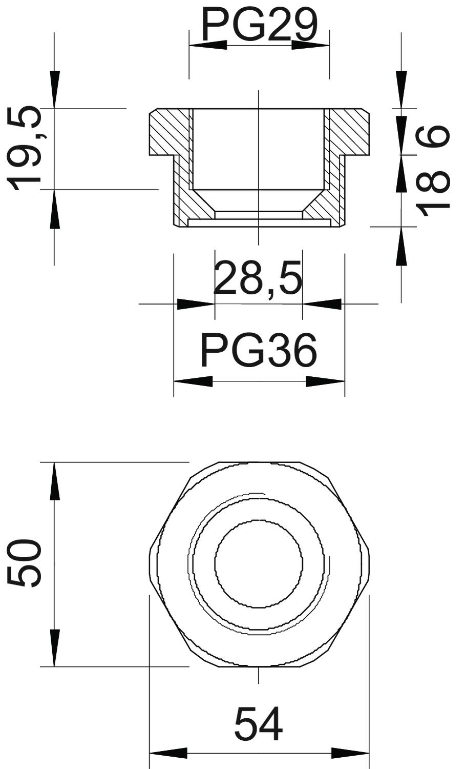 Comprimento da rosca 18 mm Cor cinzento claro; RAL 7035 Dimensão PG36-PG29 Largura da chave 50 Livre de halogéneos sim Material Poliamida Medida D 28,5 mm Medida de rosca PG Exterior 36 Medida de rosca PG Interior 29 Medida E 54 mm Medida L1 18 mm Medida L2 6 mm Medida L3 19,5 mm Niquelado não Pegada de CO2 (GWP) do berço ao portão 0,11 kg CO2e / 1 Peça Potegido contra explosões não Tipo de rosca Rosca externa PG Tipo de rosca Rosca interna PG - Todos os tipos