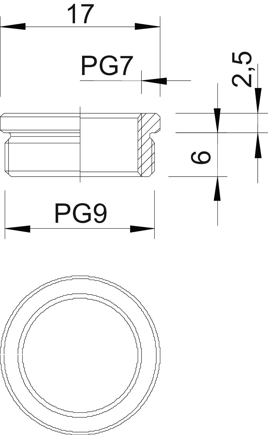 Descrição do produtoRedução (peça H) conforme a norma DIN 46320, com rosca PG conforme DIN 40430, para a transição de um furo roscado PG para um bucim mais pequeno.