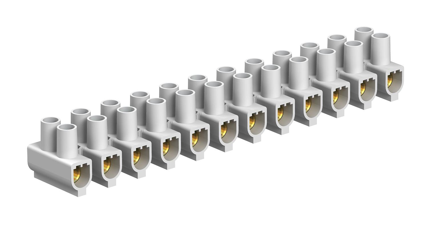 Bornes em latão, parafusos em aço, galvanizados a zinco e passivados de forma transparente, de 12 polos, régua separável em réguas de bornes individuais.