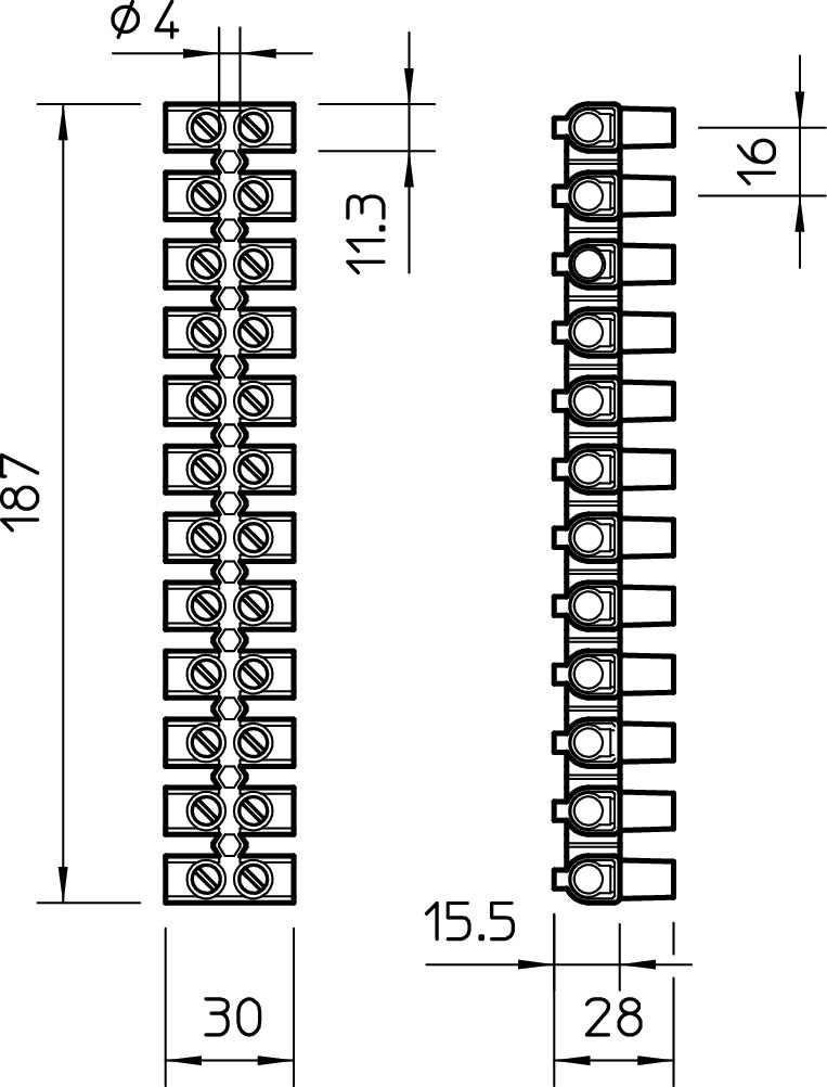 Bornes em latão, parafusos em aço, galvanizados a zinco e passivados de forma transparente, de 12 polos, régua separável em réguas de bornes individuais.