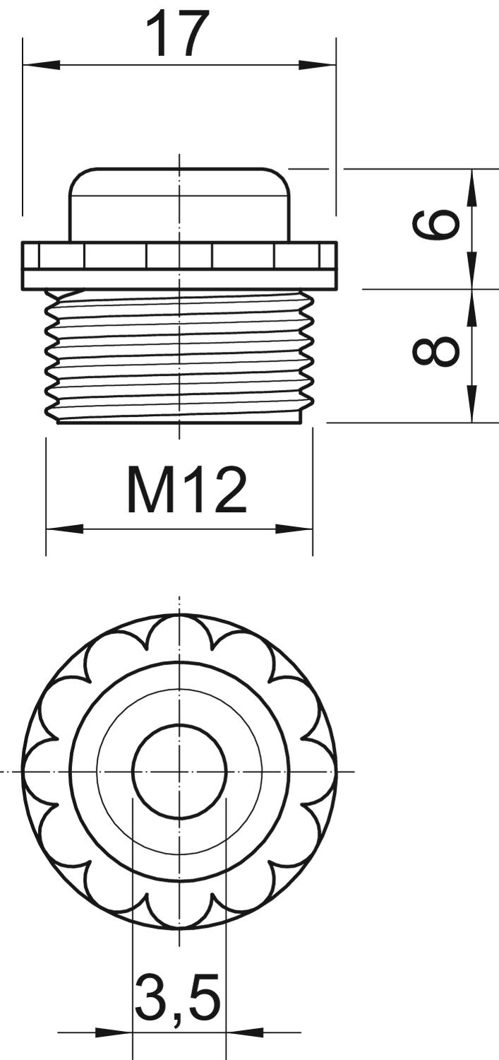 Comprimento da rosca 8 mm Cor cinzento claro; RAL 7035 Dimensão M12 Grau de proteção IP54 Largura da chave 13 Livre de halogéneos sim Material Polietileno Medida D 3,5 mm Medida E 17 mm Medida L1 8 mm Medida L2 6 mm Pegada de CO2 (GWP) do berço ao portão 0,0028 kg CO2e / 1 Peça Tamanho M12 - Todos os tipos