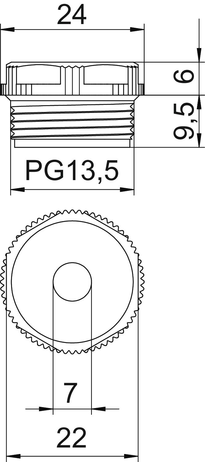 Comprimento da rosca 9,5 mm Cor cinzento claro; RAL 7035 Dimensão PG13,5 Grau de proteção IP54 Largura da chave 22 Livre de halogéneos sim Material Polietileno Medida D 7 mm Medida E 24 mm Medida L1 9,5 mm Medida L2 6 mm Pegada de CO2 (GWP) do berço ao portão 0,0065 kg CO2e / 1 Peça Tamanho Pg 13,5 - Todos os tipos