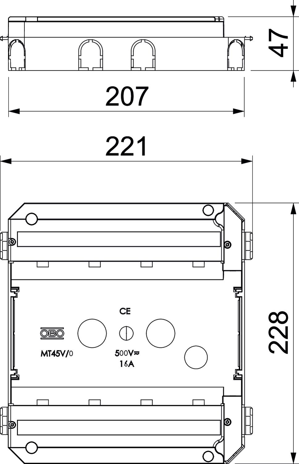 Estruturas MT45V para a instalação de aparelhos de Modul 45 e os suportes para caixas de derivação MPMT45 para conectores de dados podem ser encomendados em separado. Os furos na parede lateral para entrada de tubos têm um diâmetro de 21 mm.