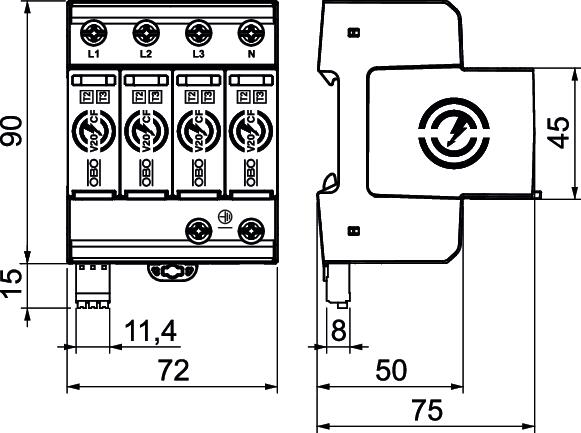 À prova de curto-circuito sim Adequado para uso exterior não Altura 105 mm Binário 4,5 Nm Capacidade de extinção de "follow current" (eff) [N-PE] 100 kA Classificação segundo EN 61643-11 Tipo 2 Classificação segundo IEC 61643-1 classe II Comprimento 75 mm Configuração de rede outros Configuração de rede TN sim Configuração de rede TN-C sim Contactos FM Inversor Dimensão 300V Fluxo de ar não Gama de temperaturas de aplicação máx. 85 °C Gama de temperaturas de aplicação mín. -40 °C Grau de proteção IP20 Humidade do ar máx. 95 % Humidade do ar mín. 5 % Intensidade nominal de descarga (8/20 µs) [L-N] 20 kA Intensidade nominal de descarga (8/20 µs) [N-PE] 40 kA Largura 72 mm Número de polos 3 Potência de comutação CA 230 V; 0,5 A Potência de comutação CC 230 V; 0,1 A / 75 V; 0,5 A Potência de dissipação (8/20 µs) [total] 120 kA Potência de dissipação máxima (8/20 μs) [L-N] 40 kA Potência de dissipação nominal máxima (8/20 μs) [N-PE] 65 kA Resistência a curto-circuito com proteção máx. contra sobretensões na rede elétrica 50 kA eff Secção transversal de ligação bornes FM máx. 1,5 mm² Secção transversal de ligação bornes FM máx. 16 AWG Secção transversal de ligação bornes FM mín. 23 AWG Secção transversal de ligação bornes FM mín. 0,25 mm² Secção transversal do condutor flexível (de fio fino) 4 AWG Secção transversal do condutor flexível (de fio fino) 35 mm² Secção transversal do condutor rígida (de um fio/vários fios) máx. 35 mm² Secção transversal do condutor rígida (de um fio/vários fios) máx. 2 AWG Secção transversal do condutor rígida (de um fio/vários fios) mín. 16 AWG Secção transversal do condutor rígida (de um fio/vários fios) mín. 2,5 mm² Secção transversal flexível (de fio fino) mín. 16 AWG Secção transversal flexível (de fio fino) mín. 2,5 mm² Sinalização no aparelho ótico Sobretensão temporária [L-N] - fail safe mode - 120 min 442 V Sobretensão temporária [L-N] - withstand mode - 5 s 337 V Tensão contínua máxima (N-PE) 305 V Tensão máxima de funcionamento (L-N) 300 V Tensão nominal CA (50 / 60 Hz) 240 V Tensão residual [L-N] @ 1 kA 0,8 kV Tensão residual [L-N] @ 5 kA 1 kV Tipo de montagem Calha DIN de 35 mm Versão do polo 3 - Todos os tipos