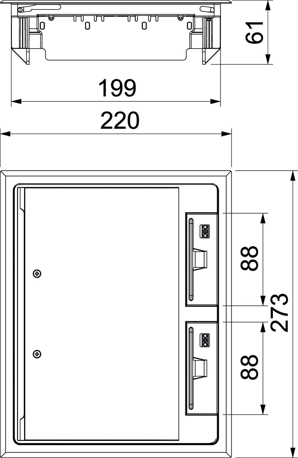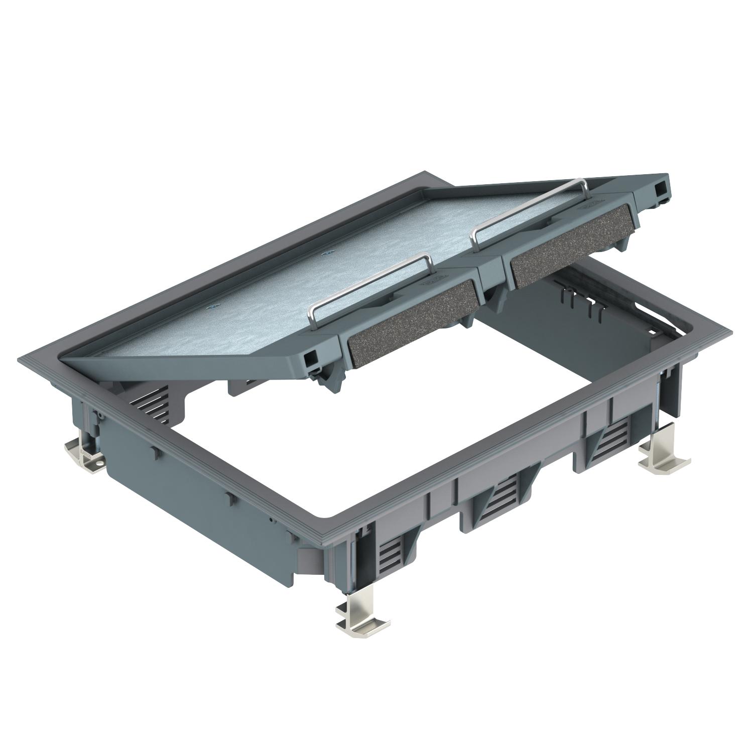 Descrição do produtoTampa de encastramento para 6 aparelhos de instalação em 3 suportes universais UT para utilização em chão falso em interiores. Fixação com uma amplitude de aperto para placas até 50 mm de espessura.