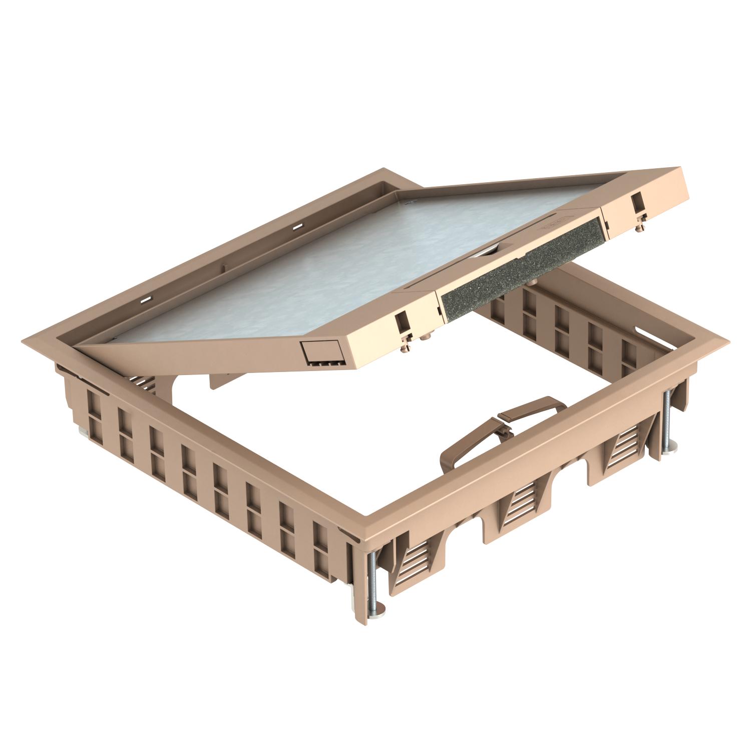 Tampa de encastramento com pega, de 3 compartimentos, para a instalação de suportes de aparelhos MT9. Podem ser instalados 3 placas de suporte APMT5. Revestimento na tampa com 5mm, ajustável também para 10 mm, para acabamento do pavimento.